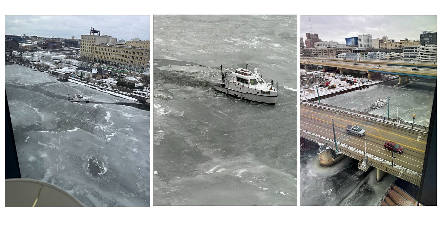 Yesterday I got to feel like James Cameron as I filmed a boat trying to navigate the frozen river. I have no idea why they were doing this. They also disrupted the nice serene surface and really messed up my view. For no apparent reason. They made it maybe like ¾ of a mile? As in Cameron’s film, the ice won. Please humor me, as you can see…life in this “city” is bleak.